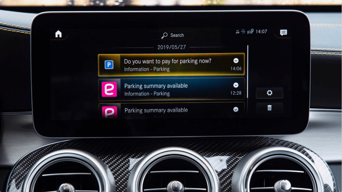 After pulling into a bay within a paid on-street parking zone, the vehicle triggers the automated parking payment using details provided by Parkopedia and EasyPark. The driver confirms the start of the parking transaction and exits the car. When the driver returns and starts the ignition, the vehicle prompts the driver to stop the parking transaction. The driver’s MercedesPay© account is then charged and an electronic receipt issued, ensuring they only pay for the actual time spent parked at that location, as opposed to potentially over or under-paying.