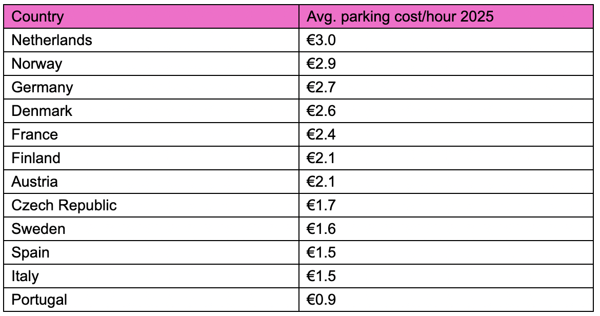 Portugal stands out as the most affordable country for parking, with an average hourly rate of €0.9. At the other end of the spectrum, the Netherlands remains the most expensive, with rates averaging €3.0 per hour. Countries like France, Austria, Germany and Norway fall in between.