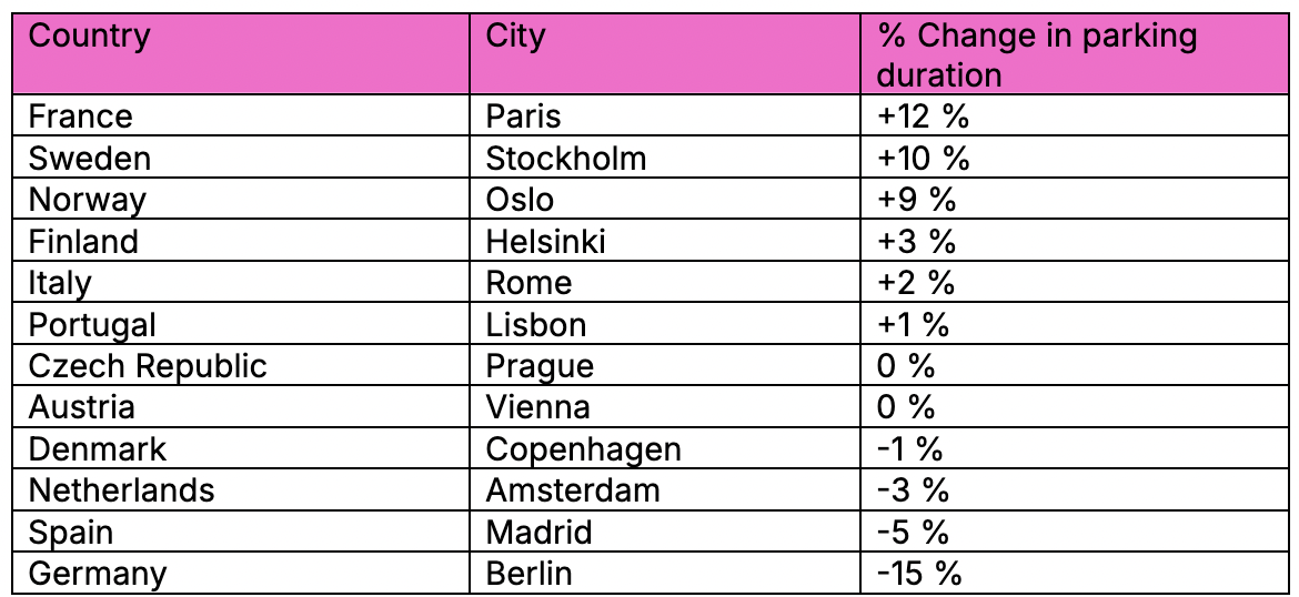 Not all cities, however, are experiencing this. Berlin, for instance, recorded a 15 percent decrease in average parking time, potentially indicating a shift toward more efficient usage or changes in how people travel.